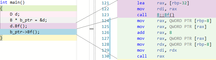 d.Bf(); 这条语句是使用对象直接调用虚函数,在汇编代码的第 123 行可以看出在编译期就确定了是直接调用函数 B::Bf()。而后一条语句b_ptr->Bf();通过指针来调用虚函数时,则多出了几步: